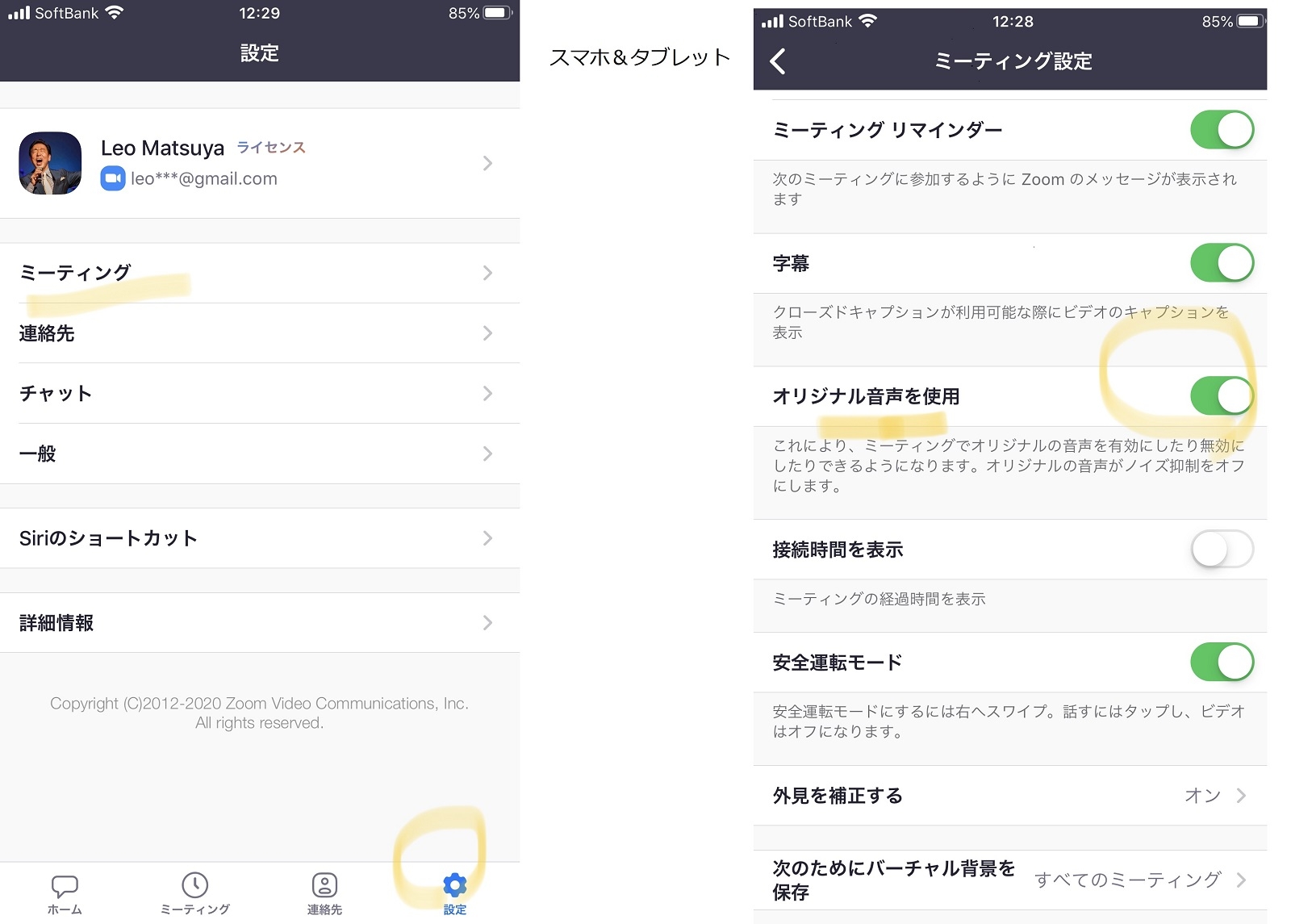 1.Zoomアプリの右下(左上の場合もある?)の「歯車マーク」をタップ